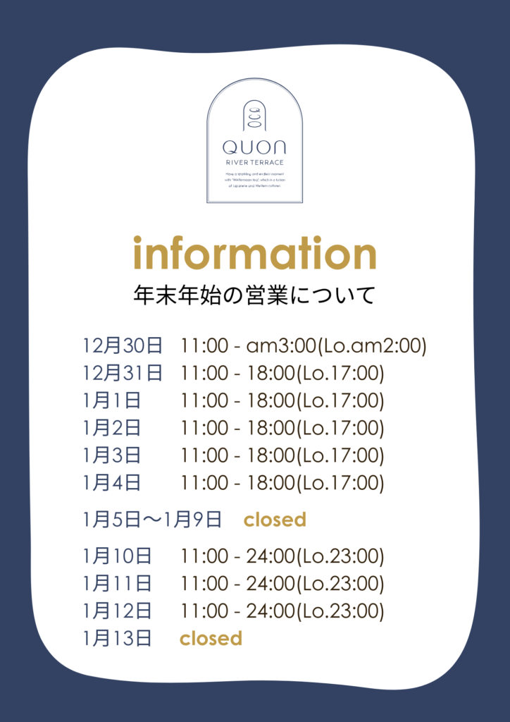 本年も私どもQUON RIVER TERRACEをご愛顧下さり、誠にありがとうございます。
